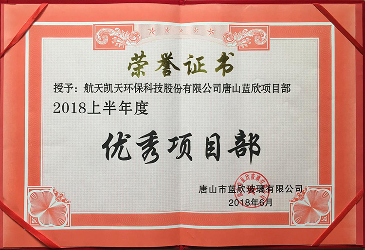 本项目是我司在唐山市蓝欣玻璃有限公司实施的第三个项目,前期实施的#1、#2,#3线项目获得业主的高度与认可。本项目首次在玻璃行业应用力热管换热器和烟道热态开孔,专业技术复杂,施工难度高。项目于2018年6月通烟并切换多条生产线试运,均达到技术协议要求,满足国家排放标准。试运行结束后,业主对我司进行表彰,本项目获评为业主单位2018年上半年度优秀项目称号。