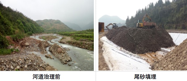 主要建设内容:对砷超标河段内的河道沉积物进行筛分,废石运送至废石堆场或码砌河道两侧,其中废石堆场处置量约为1.27万m3,废石码砌量约为8.13万m3。尾砂运输填埋至新建填埋场填埋处置,填埋场底部采取HDPE膜防渗处理,封场采用HDPE膜+复合排水网格+种植土,填埋场顶部进行绿化,已清运的河道进行浆砌片石护坡处理。