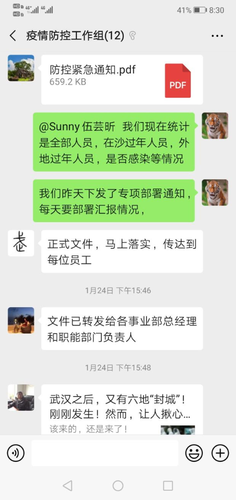 时值新春佳节之际,公司员工分散在全国各地,为更好地传达集团公司、湖南航天及公司相关文件和精神要求,在利用原有微信工作群基础上,航天凯天环保结合公司实际和分工情况,第一时间建立了疫情防控工作组、新型肺炎每日零报告群,积极部署相关工作,每日报告本单位、部门人员情况;为加强对湖北省内项目公司情况及时了解,成立了湖北疫情通报微信群,每日各项目汇报人员情况。