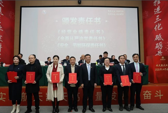 会议现场,公司领导向各经营单元、市场单元颁发了2025年《经营业绩责任书》《全面从严治党责任书》《安全、节能环保责任书》,向各职能部门颁发了《全面从严治党责任书》《安全、节能环保责任书》。