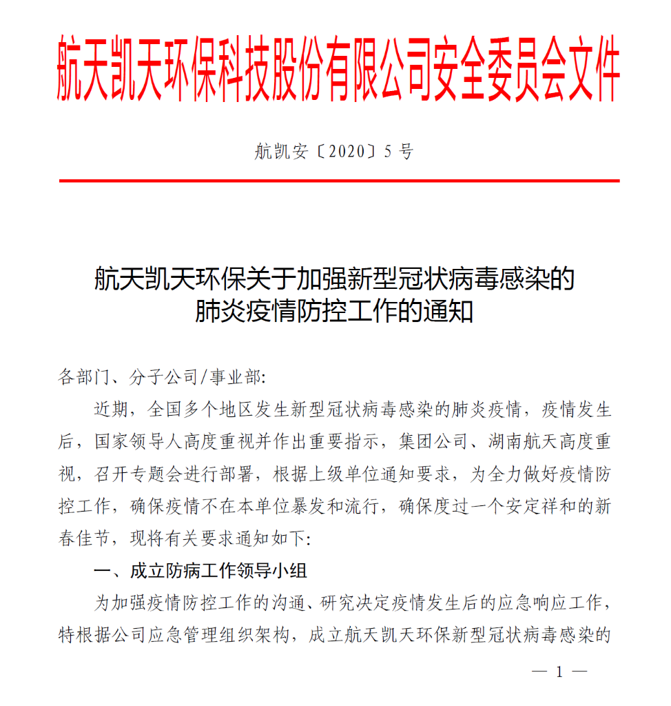 随着新型冠状病毒肺炎疫情日益严重,自防疫攻坚战打响以来,航天凯天环保高度重视,迅速部署。根据集团公司、湖南航天要求,1月22日,董事长宋卫武、总裁叶明强分别对航天凯天环保疫情防控工作做了部署和要求,成立了疫情防控工作小组,1月23日,正式下发《航天凯天环保关于加强新型冠状病毒感染的肺炎疫情防控工作的通知》(航凯安〔2020〕5号)全面部署疫情防控工作,全力做好疫情防控工作。