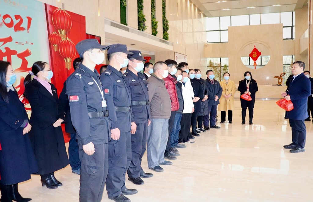 焦继革询问了在园区过年的员工和值班的同志生活情况及后勤保障工作,与在场的同志一一握手拜年,并送上节日祝福和慰问品,祝大家身体健康,万事如意,牛年大吉。