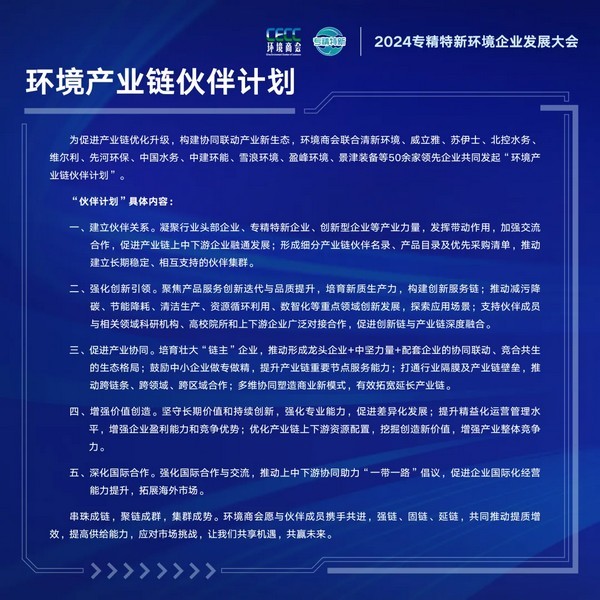 为促进产业链优化升级,构建协同联动产业新生态,环境商会联合50余家领先企业共同发起“环境产业链伙伴计划”。伙伴计划旨在凝聚产业链上下游企业,聚焦产品服务创新迭代与品质提升,着力打造具有带动能力和协同效应的现代化环境产业链,强链、固链、延链,促进产业协同发展。