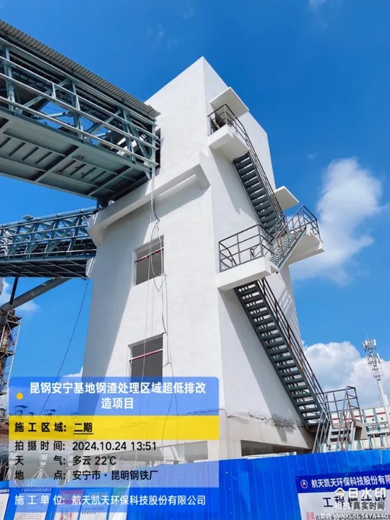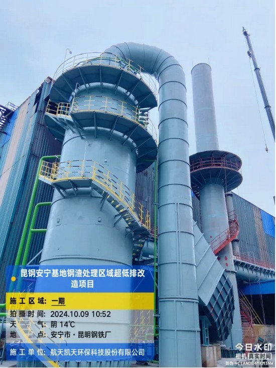 在武昆股份安宁基地钢渣处理区域超低排改造项目中,施工组成员始终坚持奋战在项目一线。项目负责人为推动项目早日投产,积极优化进度,组织施工单位加快施工。各专业工程师主动承担巡查工作,事业部工程部相关领导也牵头驻场一线,精心组织一期烟气管道、二期料仓等关键构筑物的施工。为确保按时完成管廊吊装,组织了皮带、移动罩等设备进行安装调试。经过项目部及施工单位的紧张苦战,二期皮带输送系统于 10 月 28 日安全平稳、顺利投产,达到满负荷生产条件;微雾抑尘、翻盖系统于 10 月 30 日完成投产。此外,通过项目组成员多次不厌其烦地协调与沟通,成功保证了武昆股份安宁基地环保数据能够及时采集并上传至环保监控系统。昆钢项目业主对工程进度和环保效果十分满意,称赞航天凯天环保是一支能征善战、战之必胜的队伍。