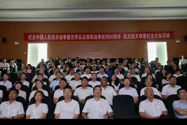 9月3日,为深切缅怀革命先烈,弘扬伟大抗战精神,激发全体员工的爱国热情与奋斗意志,航天凯天组织在家领导、党员干部职工在公司学术报告厅集中观看纪念中国人民抗日战争暨世界反法西斯战争胜利80周年大会直播。