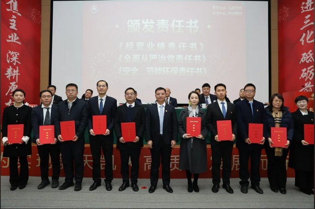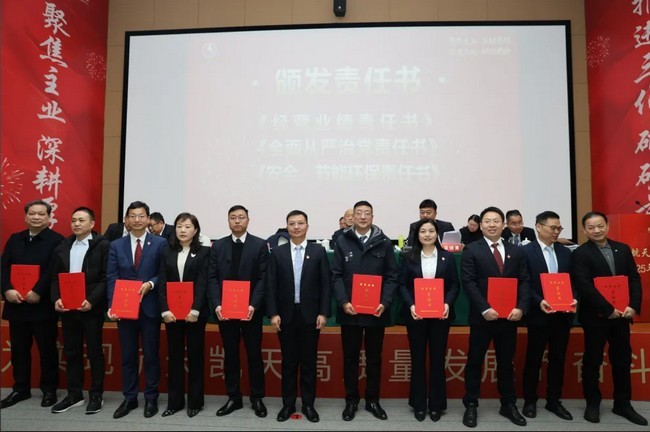 会议现场,公司领导向各经营单元、市场单元颁发了2025年《经营业绩责任书》《全面从严治党责任书》《安全、节能环保责任书》,向各职能部门颁发了《全面从严治党责任书》《安全、节能环保责任书》。